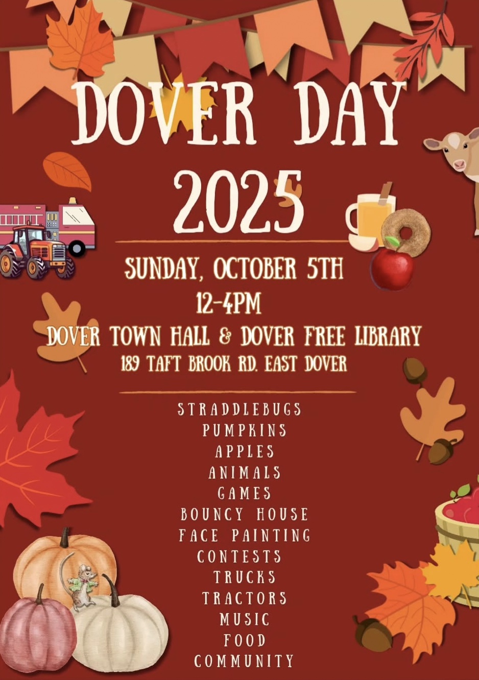 Join the Town of Dover for Dover day, a day filed with straddle bugs, pumpkins, apples, animals, games, bouncy houses, face painting, trucks, tractors, food, music and so much more! The Dover Town Hall and The Dover Free Library from 12-4pm!