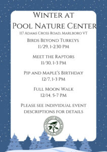 We’ll meet some of our nocturnal education animals, discuss what it takes to thrive in the cold, dark night and then take a walk to see what’s happening out there. There will be plenty of time for questions and we’ll take some time to engage all of our senses when our eyes are coming up short. Donations are appreciated to support our programming and care for our non-releasable animals. The Pool Nature Center is located at 117 Adams Crossroad in Marlboro, VT