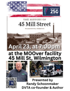 Randy Schoonmaker presents, “45 Mill Street” @7pm in the MOOver facility, 45 Mill Street. The 100-year history of this site before the MOOver. It is a story rich in different uses, products made, and the work life of Wilmington. Guaranteed to surprise you!