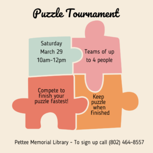 Join the Pettee Memorial Library for a puzzle tournament on Saturday, March 29. Compete to finish your puzzle the fastest and take your puzzle home with you!