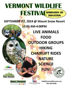 In partnership with the Southern Vermont Deerfield Valley Chamber of Commerce, the Town of Dover Vermont and Mount Snow Resorts, The Vermont Museum of Natural History is pleased to return to Mount Snow with our 14th Vermont Wildlife Festival! This event will bring together dozens of organizations connected to the outdoors in New England. Learn about flyfishing, the VT Bear Project , Turtle Rescue and Outdoor Survival! Meet live animals, enjoy kid’s activities, great food and presentations from organizations from around the region.
