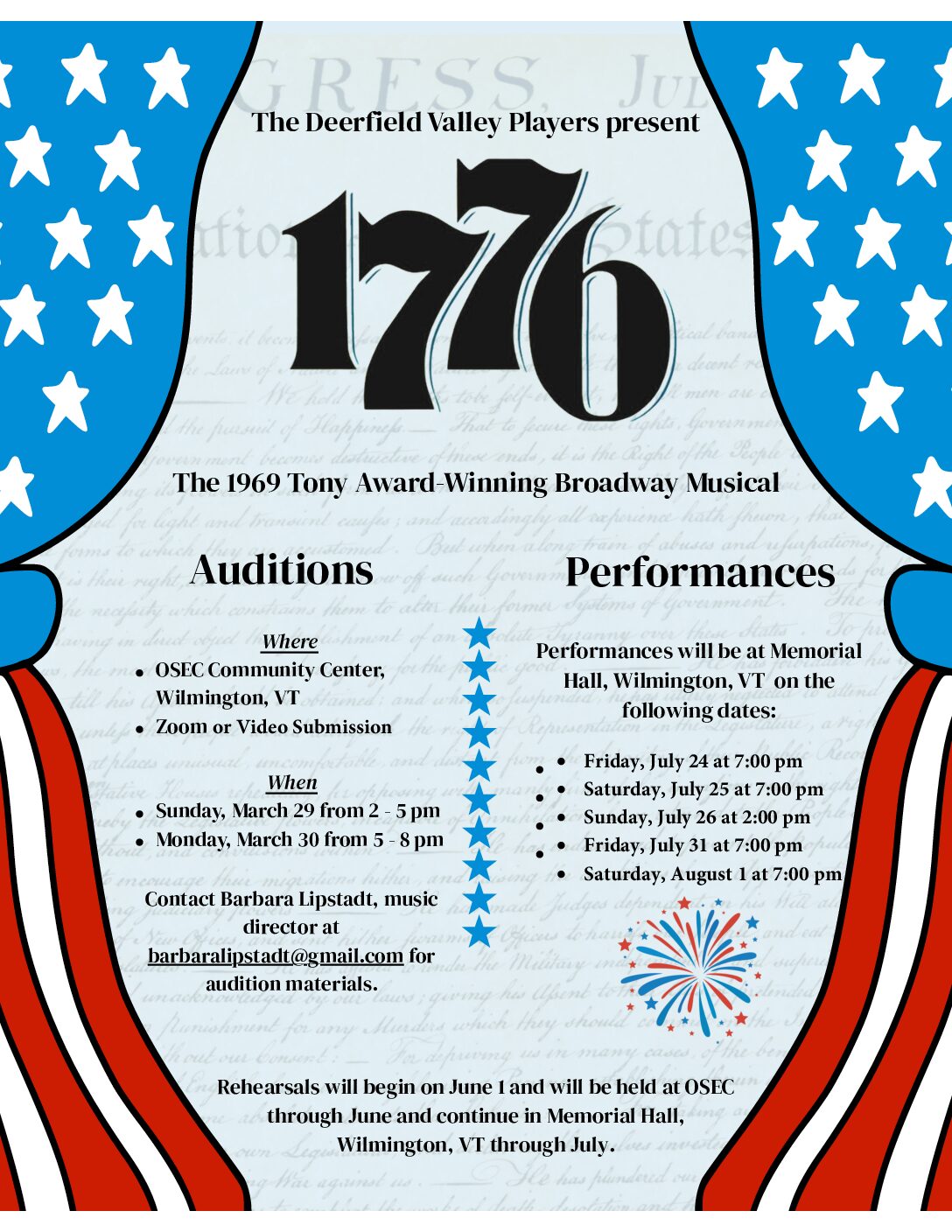The 1969 Tony Award-Winning Broadway Musical is coming to Wilmington! Performances will be at Memorial Hall, Wilmington, VT, on the following dates. Friday, July 24 at 7 pm Saturday, July 25 at 7 pm Sunday, July 26 at 2 pm Friday, July 31 at 7 pm Saturday, August 1 at 7 pm