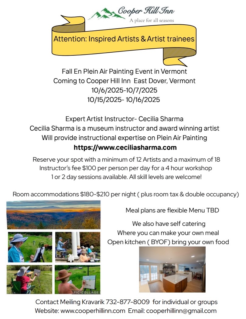 Cooper Hill Inn 117 Cooper Hill Road, East Dover, Vermont, United StatesComing to Cooper Hill Inn in East Dover, expert art instructor Cecilia Sharma will provide instructional expertise on Plein Air Painting. 1 or 2 day sessions available All Skill Levels Welcome! Room accommodations are available! cooperHillPleinAir