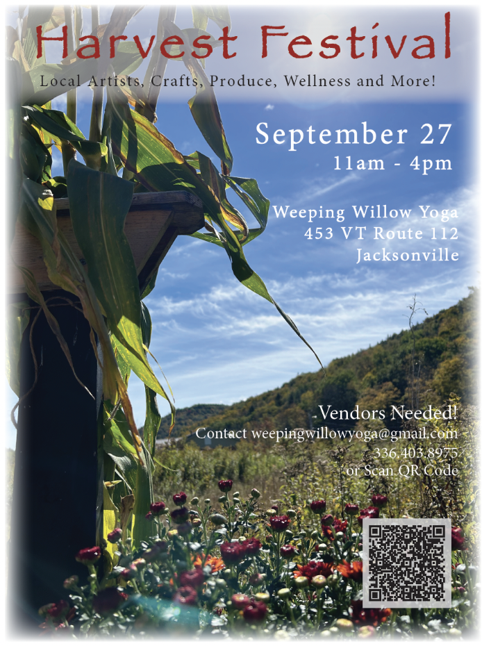 Come celebrate Fall with local vendors, produce and more in Jacksonville, VT with the 2nd annual Harvest Festival! If you are interested in becoming a vendor please reach out to weepingwillowyoga@gmail.com!